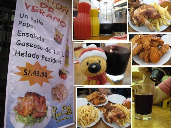 晚餐單點半隻烤雞、半隻炸雞(各附上一大盤薯條),和一壺chicha = 43 /sol