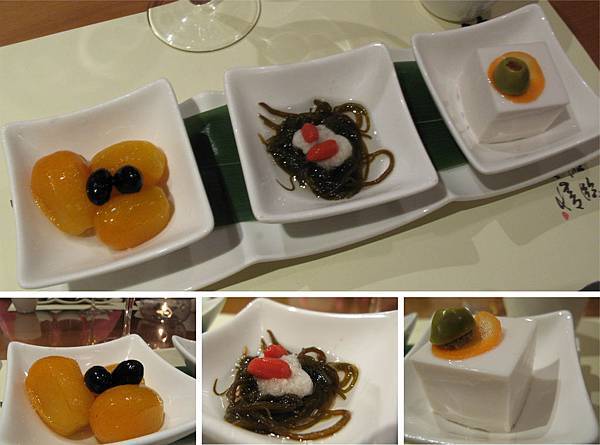 開胃冷盤左起~自釀金桔佐黑豆、海帶絲佐枸杞山藥泥、花生豆腐