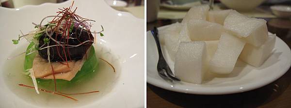 香菇鮑魚燴絲瓜、自醃蘿蔔